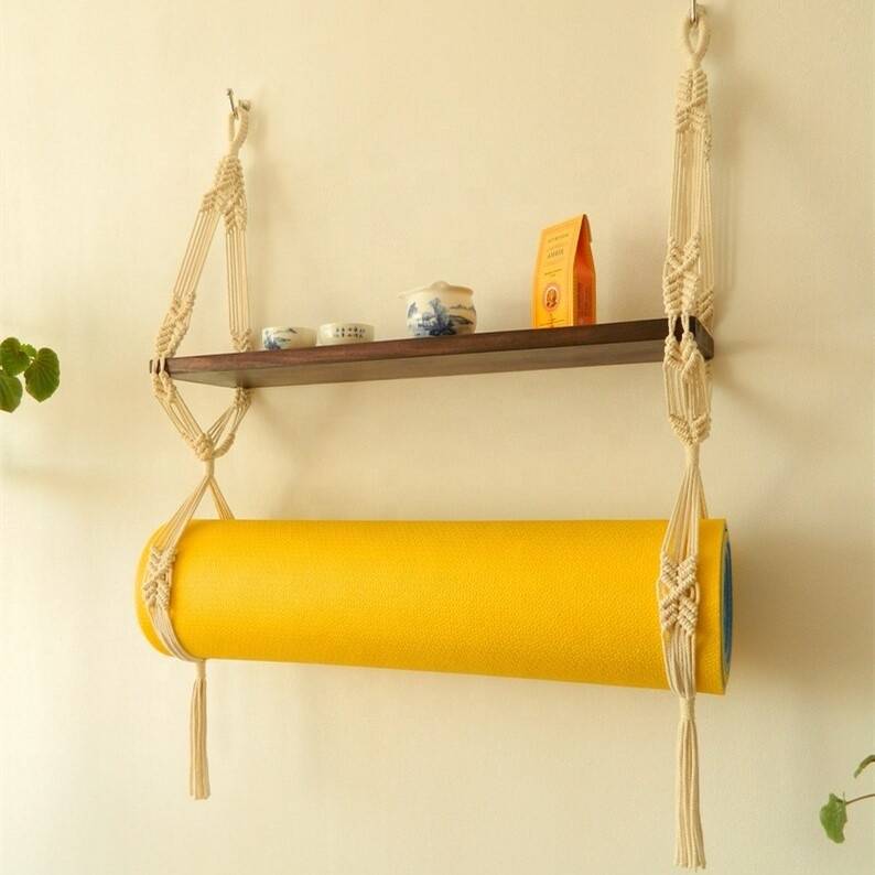 Subject: Handmade Decor Wood Board Strap Holder Macrame Yoga Mat Carrier Hanging Shelf